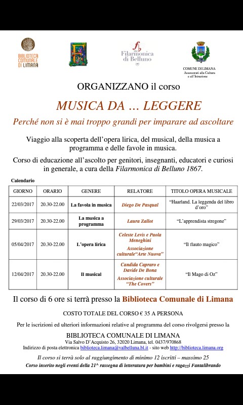 MUSICA DA….LEGGERE è un corso di educazione all’ascolto curato dalla Filarmonica di Belluno 1867 organizzato dal Comune di Limana e la Biblioteca. Il corso è rivolto a genitori, insegnanti, educatori e curiosi in generale….perché non si è mai troppo grandi per imparare ad ascoltare!