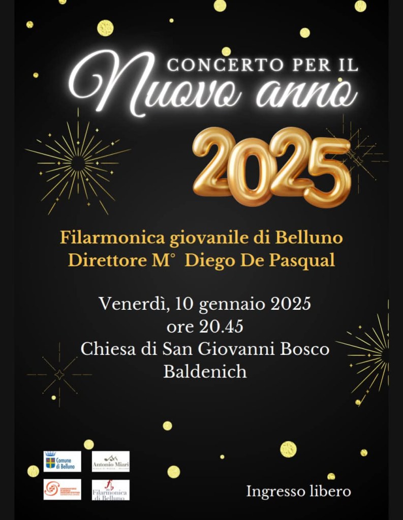 Venerdì 10 gennaio 2025 gran finale delle festività legate al Santo Natale e all’inizio del nuovo anno con il concerto della Filarmonica giovanile di Belluno diretta dal maestro Diego De Pascqual. L’evento si terrà presso la Chiesa di San Giovanni Bosco (Baldenich) alle ore 20.45.🎆